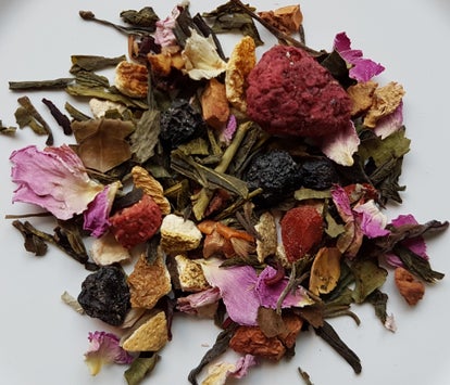 Ingrediënten: witte thee, groene thee, rozenblaadjes, sappige appelstukjes, hibiscus, sinaasappelschil, gojibessen, aroniabessen, bramenblad, frambozen en aardbeien.