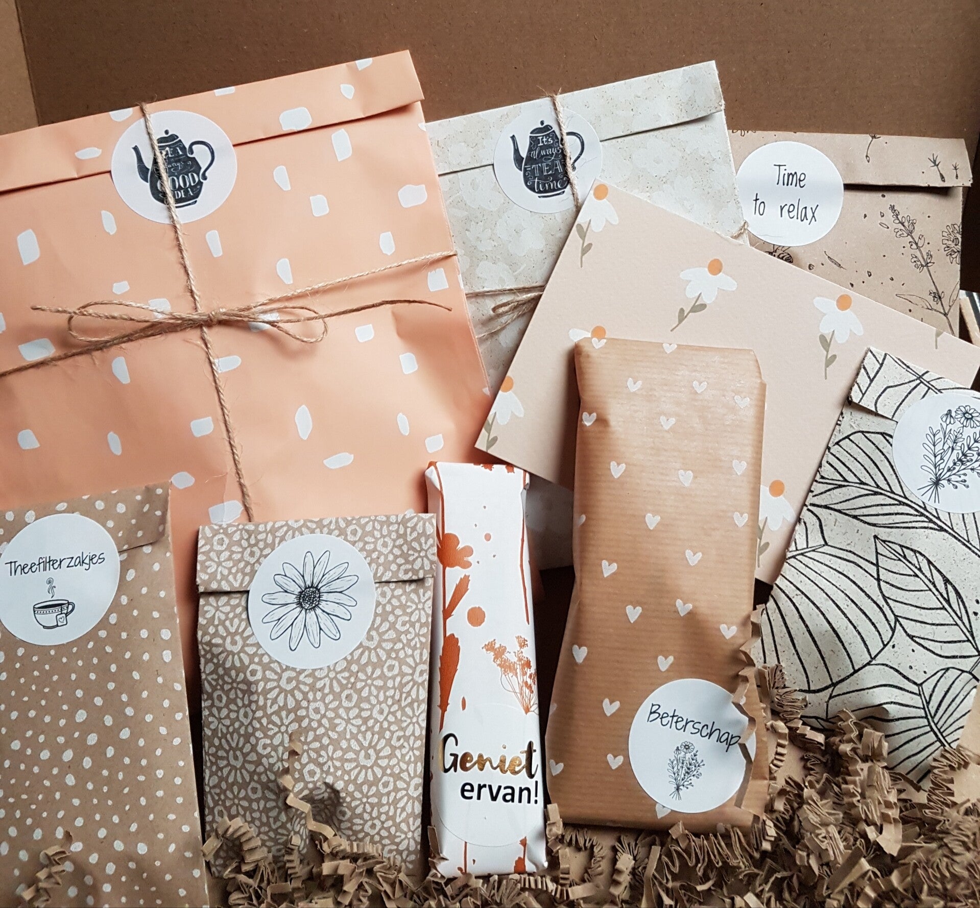 Ben jij dol op verrassingen of verras je graag iemand? Dan hebben we wat leuks voor je. Een doos vol cadeautjes. Je kunt kiezen uit een surprisebox (dit is een brievenbusdoos) of surprisebox deluxe (deze box wordt verzonden als pakketpost). In de box zit o.a. verschillende theesoorten passend bij het seizoen, theeaccessoires, iets lekkers en verwenproducten. Dus laat je verrassen of maak iemand anders blij met deze surprise box*. De boxen zijn verkrijgbaar met verschillende thema's. Zou je de box graag met een ander thema willen verzenden? Geef dit dan aan bij opmerkingen dan gaan wij kijken wat er mogelijk is. Een kaartje passend bij het thema is inbegrepen! Bij opmerkingen kun je de persoonlijke boodschap achterlaten.