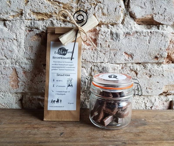 Sinterklaas cadeautje met een zakje Sinterklaasthee* incl. theefilterzakjes en een weckpotje met mini chocolade lettertjes in melk en puur.