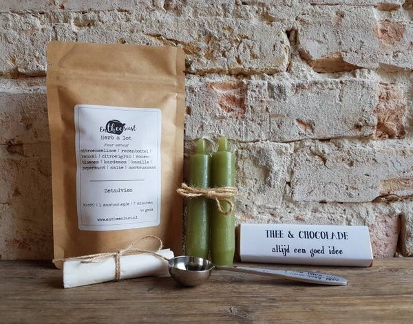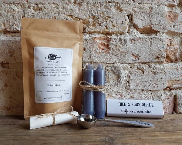 Inhoud pakketje: groot zakje thee*, theefilterzakjes, maatschepje, melk chocoladereepje met opdruk 'Thee & Chocolade altijd een goed idee' en kaarsjes naar keuze.