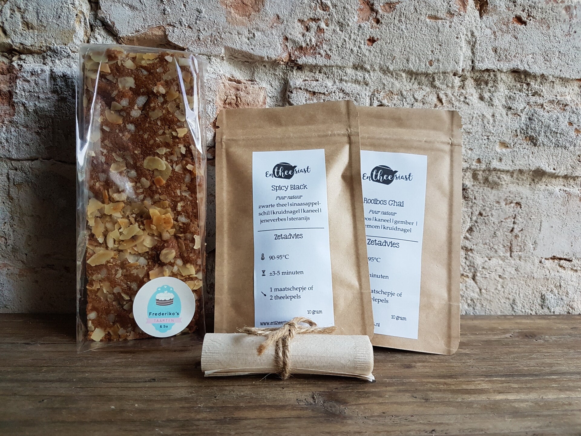 Inhoud: 1x 10 gram spicy black, 1x 10 gram rooibos chai, theefilterzakjes en huisgemaakte kruidcake.