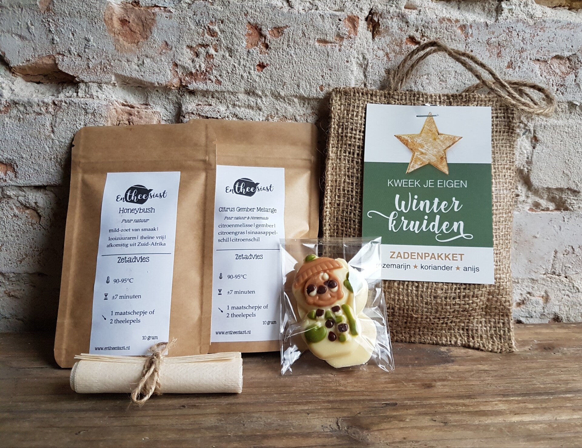 Inhoud: 2x 10 gram thee/kruiden, theefilterzakjes, 2 sneeuwpop chocolaatjes en een jute zakje zadenpakket winterkruiden met rozemarijn, anijs en koriander.