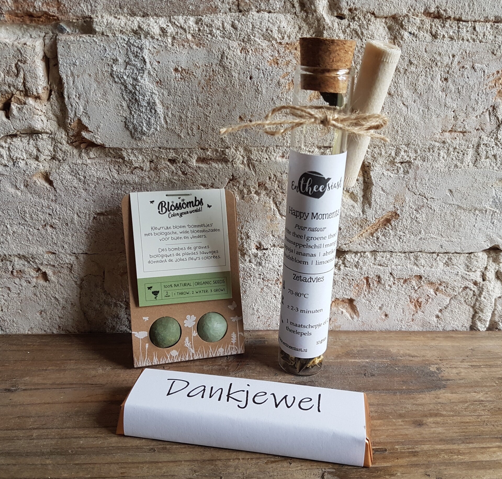 Inhoud theepakketje: glazen buisje met thee (naar keuze) en theefilterzakjes, kies hier je -> Losse thee* , melk chocolade reepje van Frou & Frou met opdruk Dankjewel*, bloemzaad balletjes van Blossombs per 2 stuks verpakt