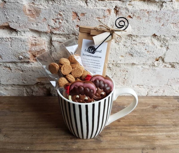 Een grote mok met Sinterklaas thee, theefilterzakjes, pepernoten en sint chocolaatjes van Frederika's Taarten ensa.