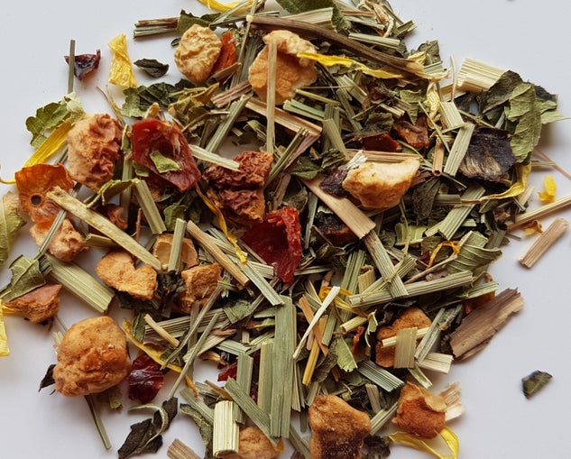Ingrediënten: citroengras, appelstukjes, citroenverbena, pepermunt, goudsbloem en rozenbottel