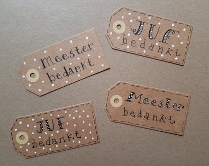 Bedankt Juf/Meester cadeaulabel.* Maak je cadeau extra bijzonder met een handgeschreven label met de tekst "Juf/Meester bedankt!".